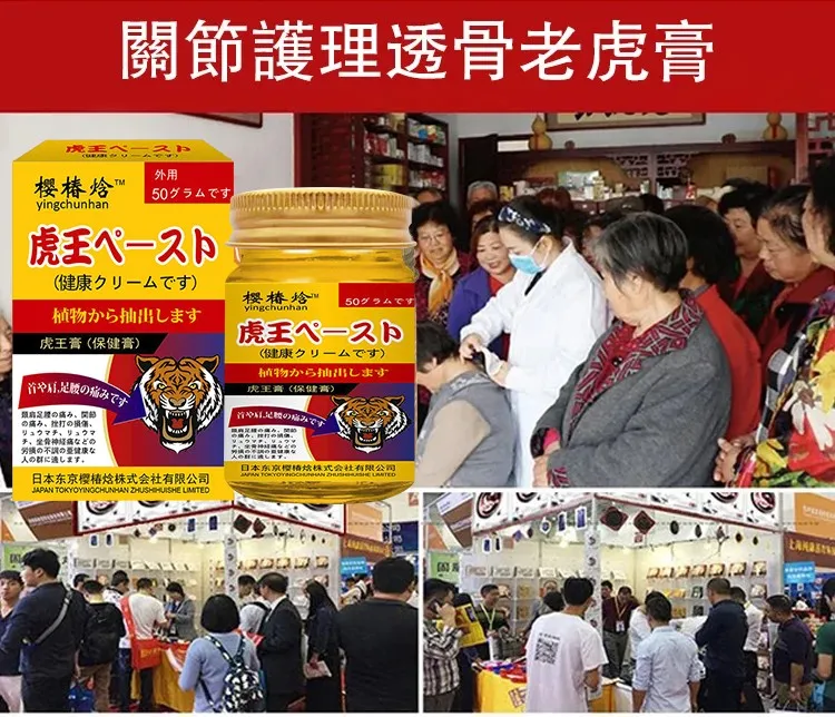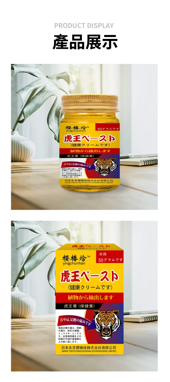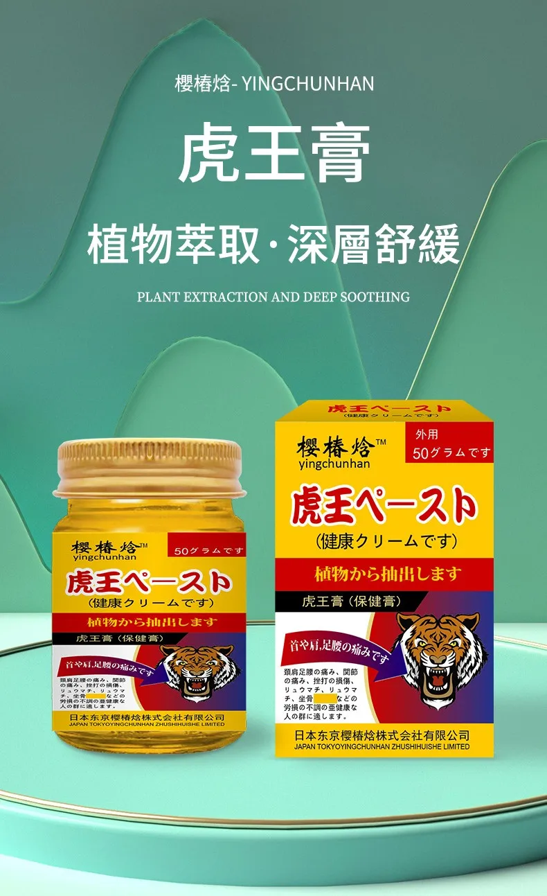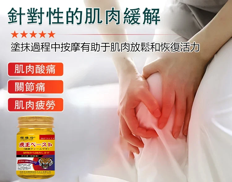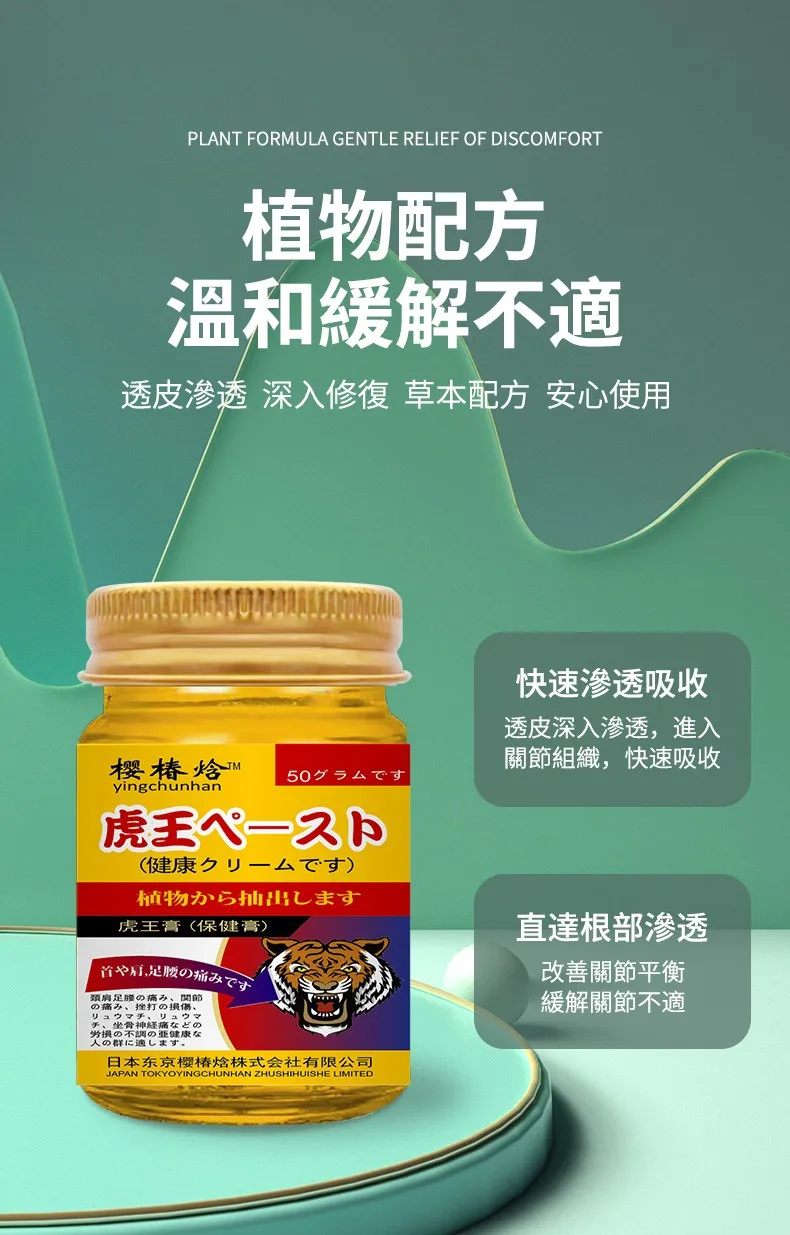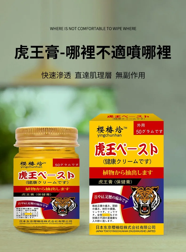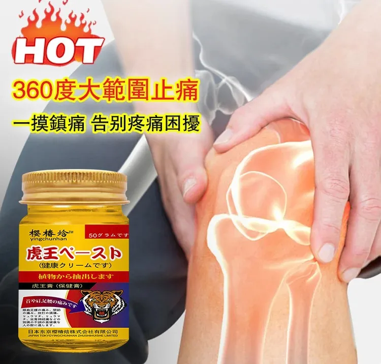 日本櫻椿焓虎王膏對於肩頸腰腿保健膏,中老年健康首選,具有活血通經、消腫止痛、緩解肌肉痠痛,能促進血液循環,對肌肉痠痛、腰腿扭傷、關節骨痛等有顯著活絡膏、關節扭傷保健膏、足部護理肌肉酸痛的外用消炎止痛藥膏。